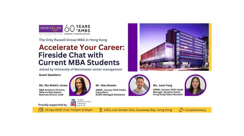 Located in Causeway Bay, the East Asia Centre of The University of Manchester is proud to present an exclusive opportunity to hear about the only Russell Group UK MBA in Hong Kong directly from current final-year Manchester Global MBA students.