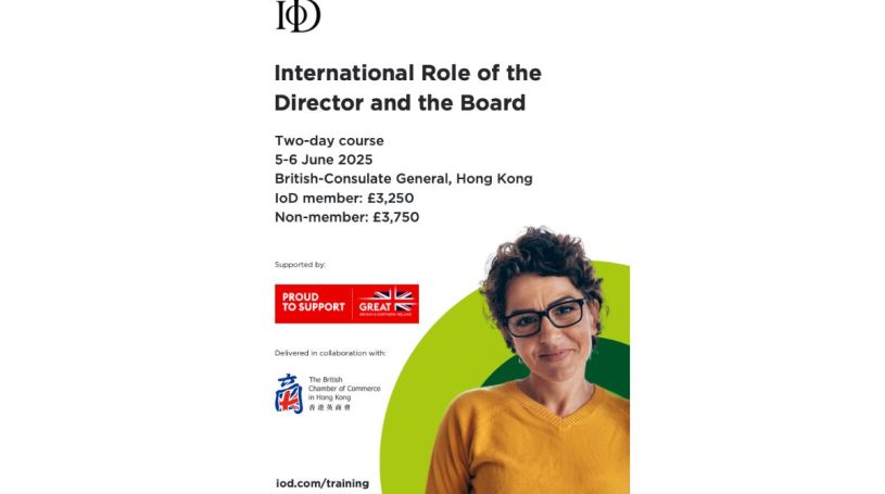 The British Chamber of Commerce in Hong Kong and the UK Department of Business and Trade (DBT) are proud to support and invite you to the IoD’s ‘International Role of the Director and the Board’(IRDB) Course and Alumni Event at the British Consulate General Hong Kong, on 5 & 6 June 2025.