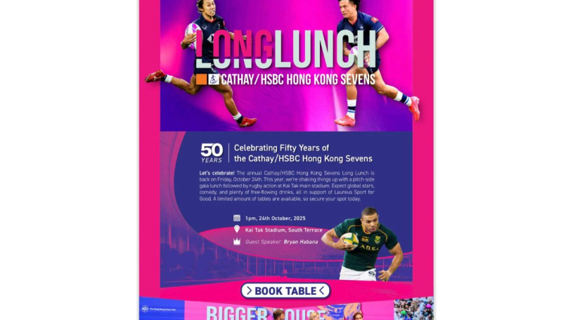 This year’s event, which will officially launch the 2026 Cathay/HSBC Hong Kong Sevens, will take centre stage on the South Terrace overlooking the famed HK7s South Stand and the spectacular setting of Kai Tak Stadium. Our entertainment throughout the afternoon will include retired Springbok rugby star and Hall of Famer Bryan Habana, and special guests including British comedian Simon Evans. The Long Lunch continues to support our official Charity Partner, Laureus ‘Sport For Good’.
